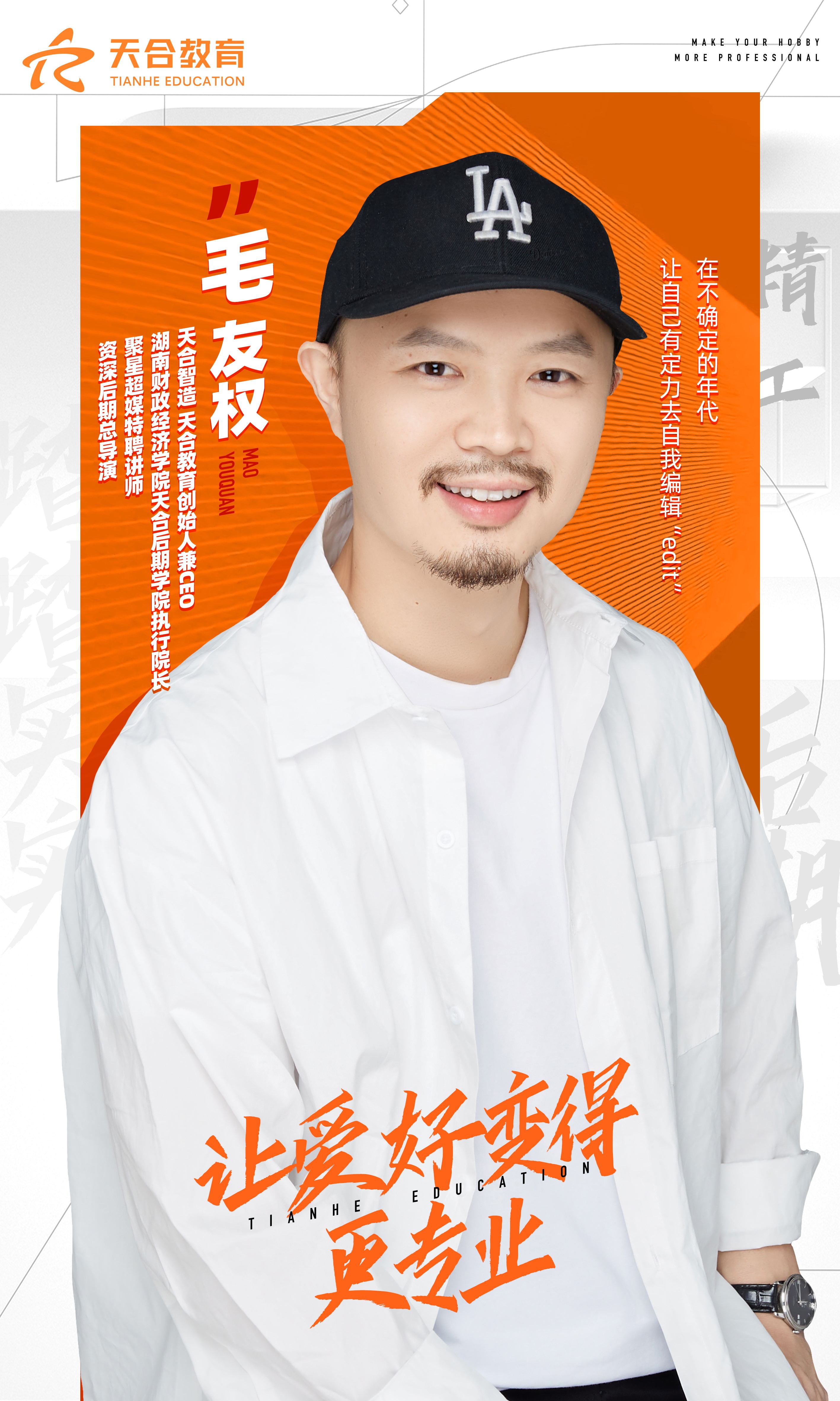 天合教育是一家依托于天合智造的影视后期人才的培训基地,拥有大量的国内顶尖的后期人才来教授学员。天合智造与天合教育的创始人毛友权,是湖南财政经济学院天合后期学院执行院长,聚星超媒特聘讲师,资深后期总导演。