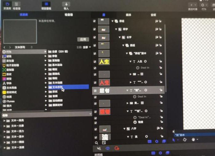 字做好以后,如果花字板式设计有双层,我们就需要把这两层放在一个组里。然后选中下面一层字,点资源库—行为—参数—链接,把第一层的字链接到下面一层字,再把行为改成文本,改字的时候两层字就可以一起变动了。字幕模板做好之后就可以来做动态了,以这个模板为例,做预设动态,打开资源库—行为—文本序列,文本序列里面有很多种预设效果。