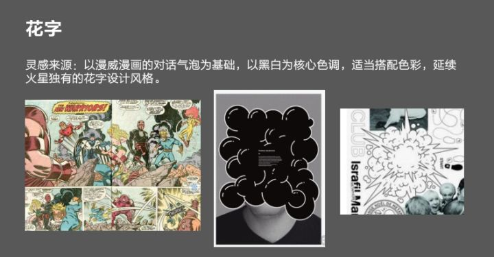 而《火星情报局》主打的,则是漫画风。以漫威漫画的对话气泡为基础,黑白为核心色调,适当搭配色彩,延续火星独有的花字设计风格。