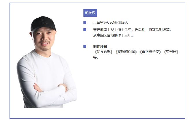 他就是,是天合智造创始人兼CEO,曾在湖南卫视工作十余年的资深后期总导演,毛友权老师!AKA 后期老毛!