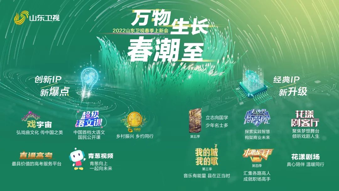 2022年,山东卫视将打造原创文化综艺矩阵,重磅推出原创戏曲类节目《戏宇宙》、文化类节目《黄河文化大会》、《国学小名士》第五季等,创新升级节目布局,加快推进深度融合,形成思想精深、艺术精湛、制作精良的山东卫视新品牌。